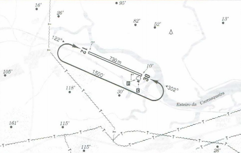 • Notas: Pista inserida na Reserva do Sapal de CM e VRSA. A operação acima de 1.000ft deve ser acautelada pois a Pista fica sob Espaço Aéreo Controlado de LPFR – FARO APP. FARO APP 119.405Mhz, FARO TWR 120.755MHz.