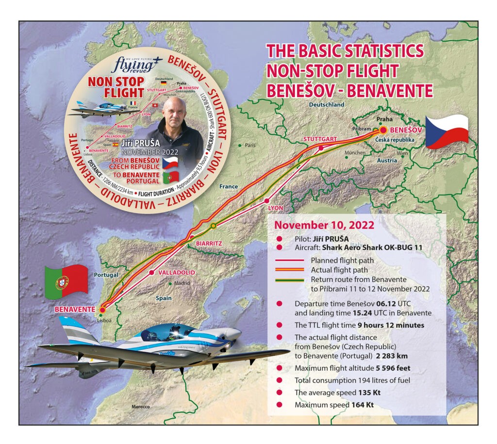 O objectivo do Cmdt Jiri Prusa, aviador, autor de vários livros relacionados com aviação e empresário aeronáutico, nascido em 1953, era fazer um voo de cerca de nove horas non stop, num Shark 600, cruzando toda a Europa, desde Benesov na Chéquia até ao Campo de Voo de Benavente em Portugal. Inicialmente, estava previsto ser efectuado no dia 8 de Novembro de 2022 mas, por razões meteorológicas, acabou por ser adiado para quinta-feira dia 10 de Novembro.