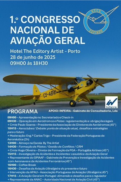 O Aeroclube da Costa Verde, encontra-se a organizar o 1 Congresso Nacional de Aviação Geral, que irá ocorrer no dia 28 de Junho de 2025, entre as 09H00 e as 18H30, no auditório do Hotel The Editory Artist, na Rua da Firmeza, Porto.